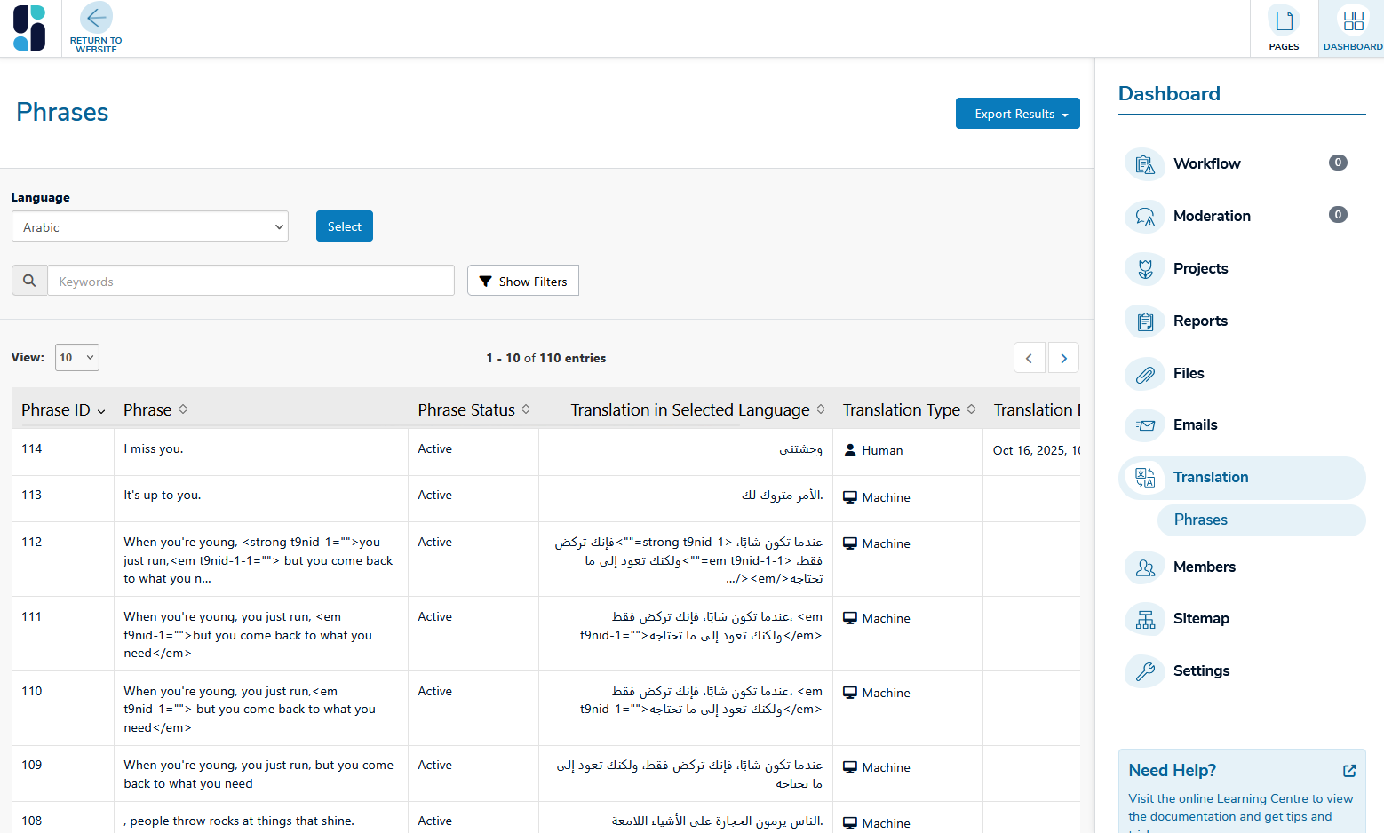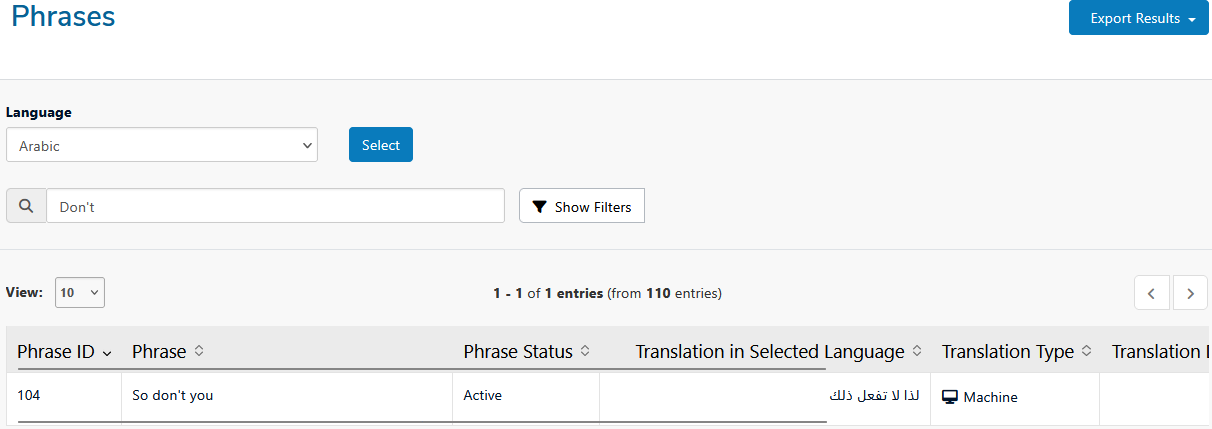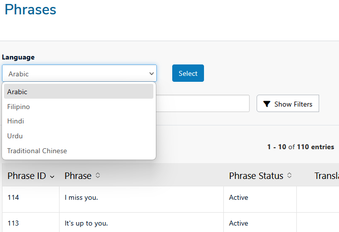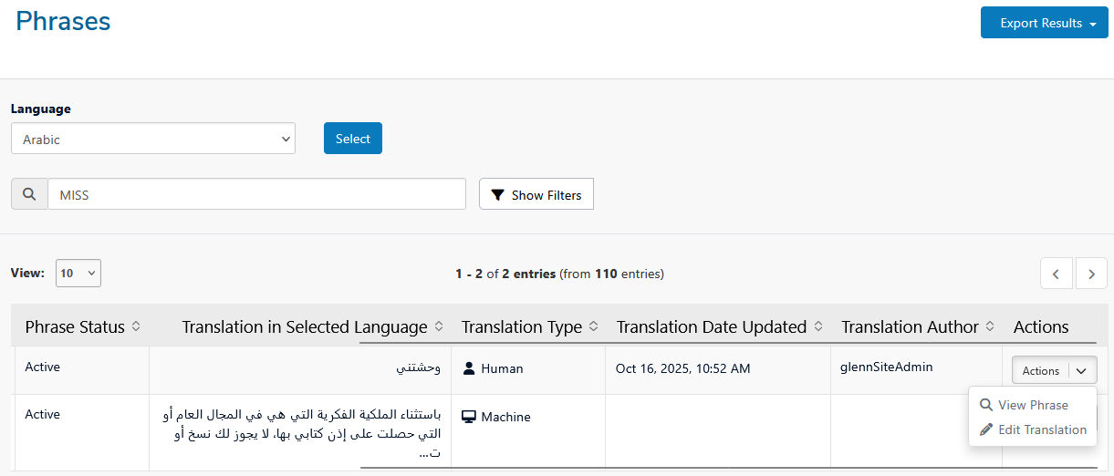 If you have the Custom Translation add-on, you’ll also have access to the Phrase Management system, which allows you to view, edit, and manage individual translated phrases in more detail.